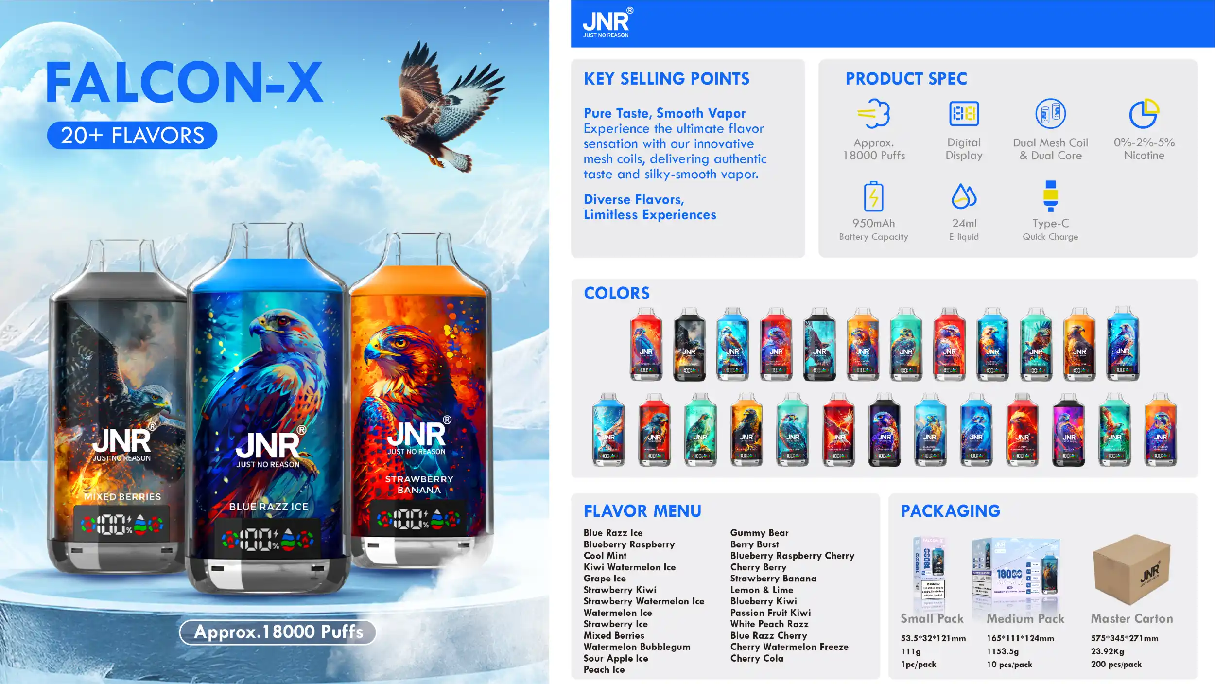 JNR Falcon 16000 delivers exceptional endurance with up to 16,000 puffs, paired with a stylish crystal-craft design and adjustable airflow. Powered by a 1Ω dual mesh coil, 22ml e-liquid and 850mAh rechargeable battery with dual charging ports, it produces dense clouds, rich flavor and strong throat hits from start to finish. With 28+ flavors and multiple nicotine options, it offers a smooth, premium vaping experience on the go.